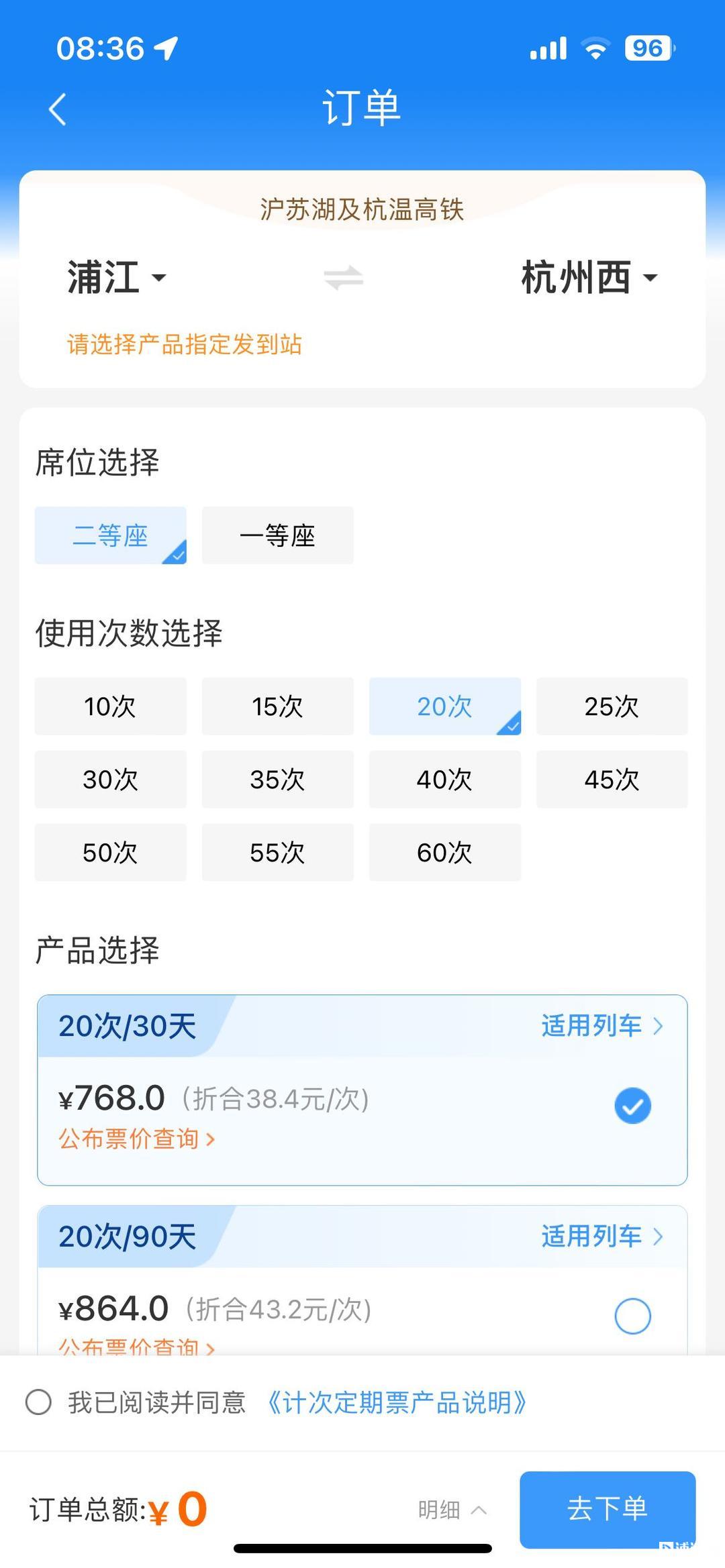 打开12306软件,点击“计次定期票”,输入出发地目的地,点击“去下单”,就可购买了,如图所示。
